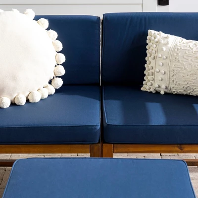 A sectional, loveseat, or a chat set: the choice is yours with the Set of 3 Contemporary Acacia Wood Modular Patio Set by Saracina Home. Two patio armchairs and one ottoman can be arranged and rearranged to satisfy your backyard seating needs. Perfectly suited for the outdoors, the solid acacia wood frame and cushion cover are both weather-resistant, so you can entertain come rain or shine. Properly care for your outdoor acacia furniture by applying teak oil every 2-3 months and keeping it out of severe weather conditions.