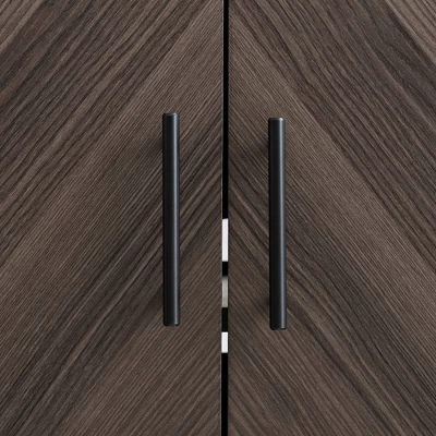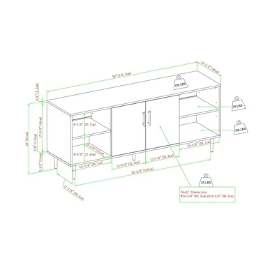 Saracina Home’s Angelo Modern Symmetrical 2-Door Bookmatch 58” TV Stand for TVs up to 65” makes a striking first impression. Two cabinet doors are finished with a fascinating, Mid-century modern-inspired faux bookmatch finish that sets the tone for your stylish living room. Swing open the entertainment console’s soft-close doors to reveal tonight’s movies and games atop an adjustable shelf. Open shelving on each side of the doors allows for easy access to media components. A cord management port keeps cables neat, so sit back and relax with an organized setup for chic movie nights at home. Overall Product Dimensions: Height: 24” Width: 58” Depth: 15.75” Open Shelving Dimensions (without shelves): Height: 17.375” Width: 15.375” Depth: 14.625” Cabinet Dimensions (without shelves): Height: 17.375” Width: 24.625” Depth: 14.375” Additional Dimensions: Leg Height: 5.5” Tabletop Thickness: 0.625”